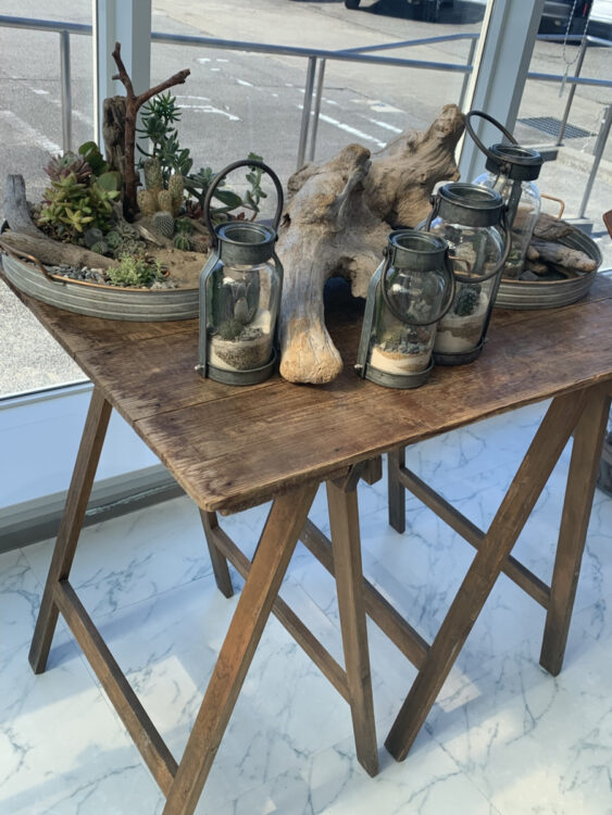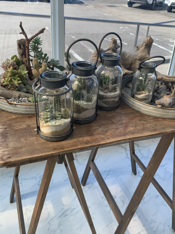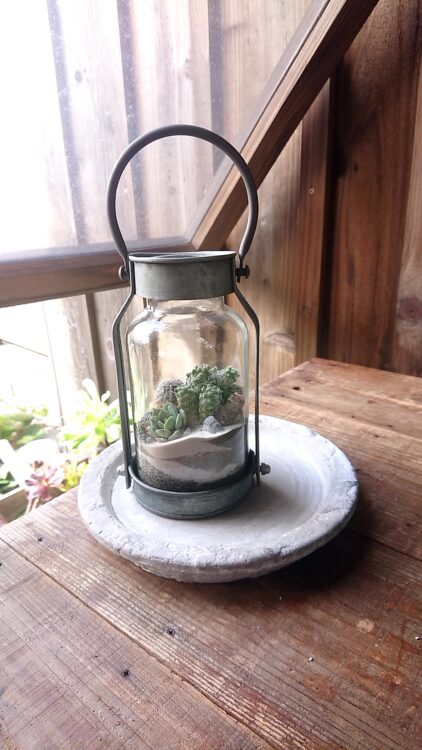 小さな多肉植物をランタンのようなガラスに砂と一緒に閉じ込める作品は、どこか砂漠のような可愛らしい姿を見せてくれます。