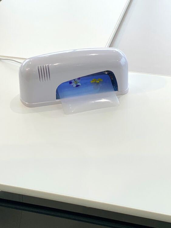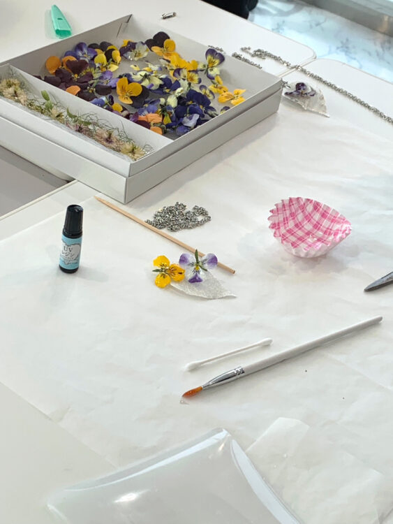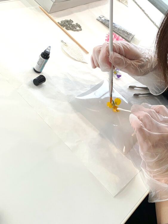 位置が決まったら、レカンフラワーをレジンでコーティングしていきます♪