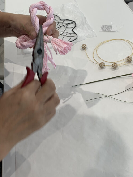 形が決まったらワイヤーとペンチで固定するのですが、しっかりと留めないと崩れるので意外と力が必要な作業だそうです!