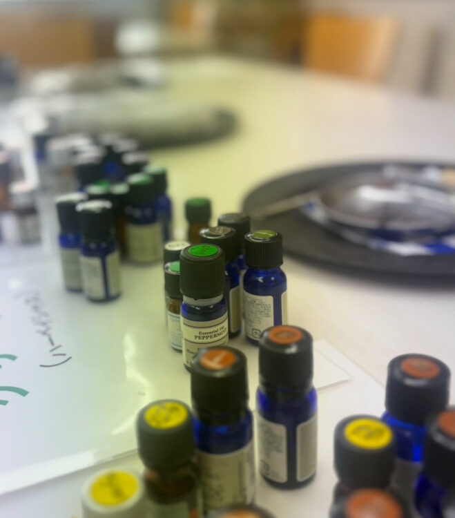 まずは先生から、たくさん種類があるアロマ一つ一つの成分や香りの説明を受けます。