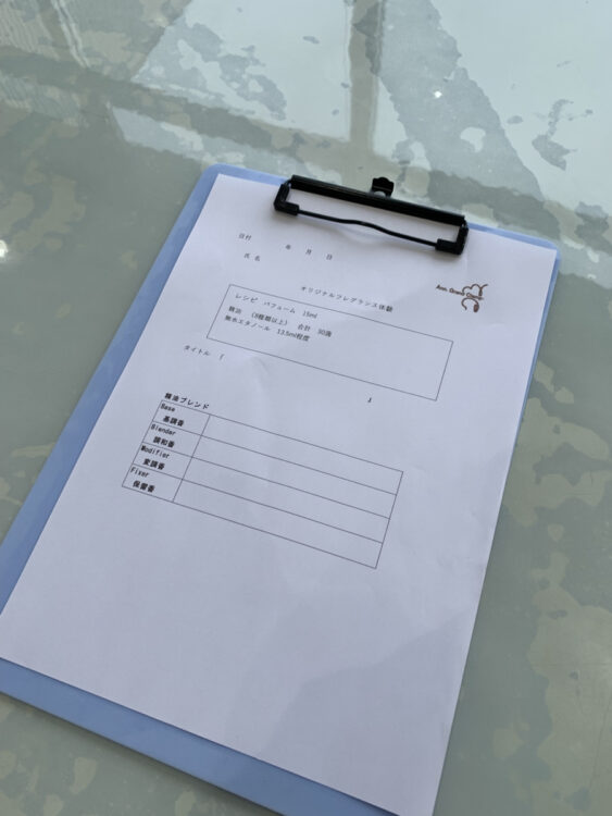 先生の説明を聞いたり、実際に先生と相談したりして作りたい香水のイメージをこのレシピに書き出していきます。