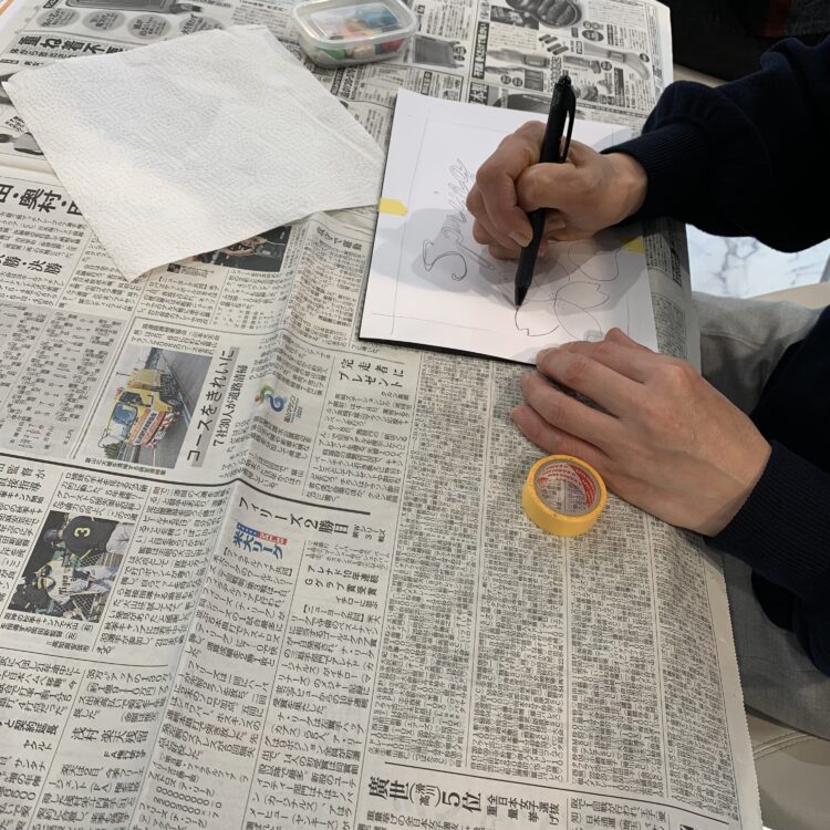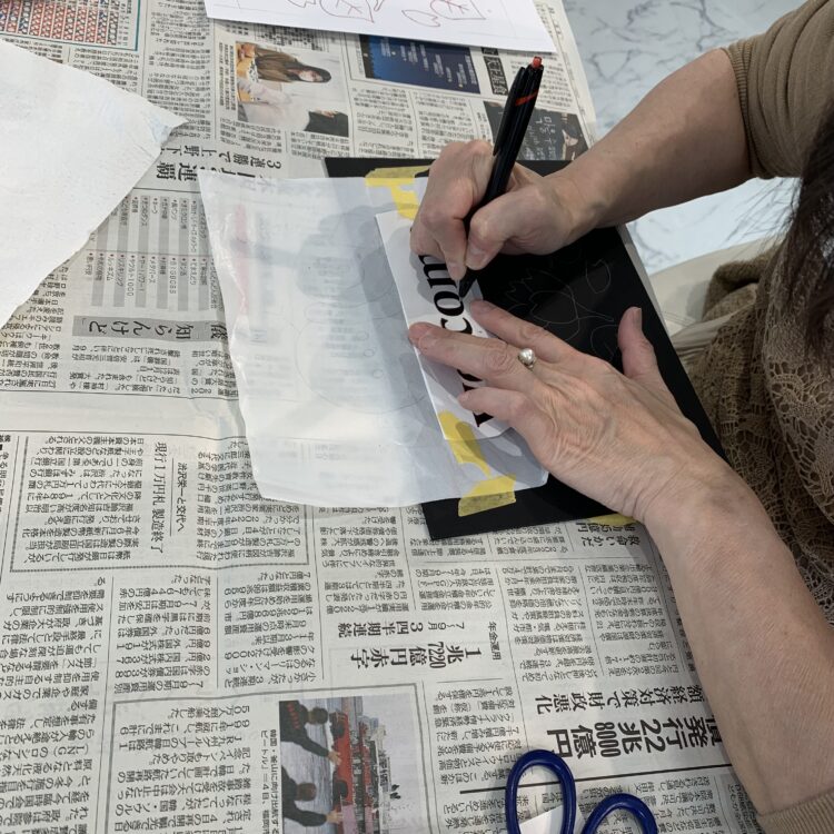 転写した下絵の輪郭をチョークで縁取っていきます。