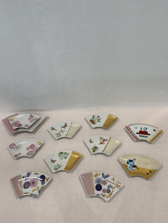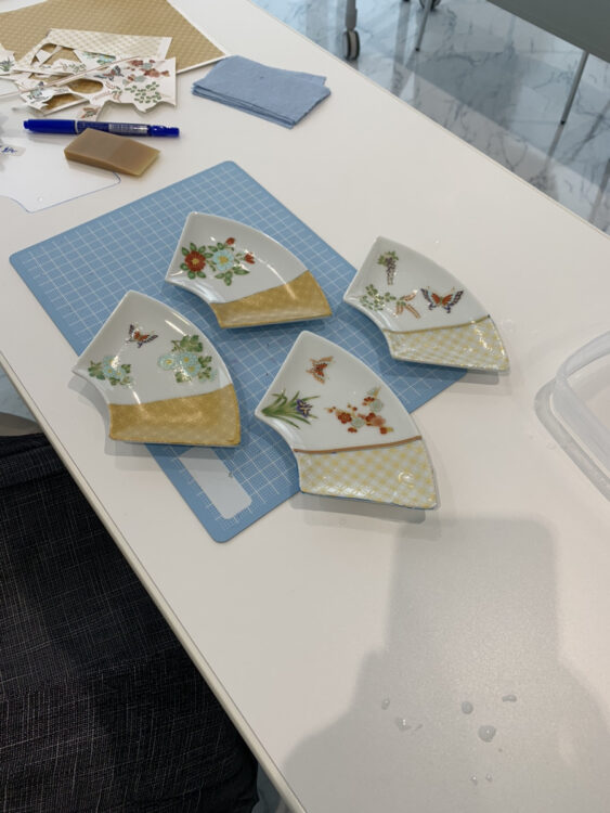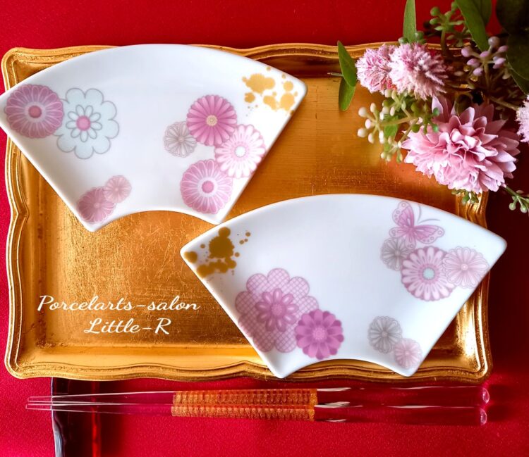 手際よく4枚のお正月らしい食器が出来上がりましたよ♪ お花が上品な雰囲気を出してくれています。