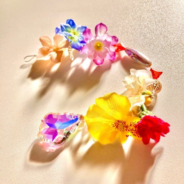 沢山のチャーム、造花のお花、ビーズをご用意しています。