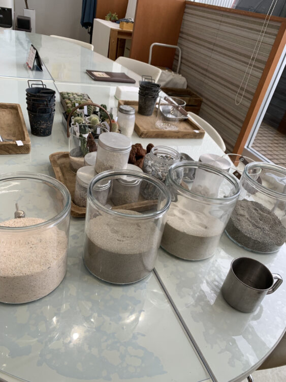 今回のレッスンでは、ガラスの中に砂や多肉植物を詰め込んで小さな自然を制作しました!