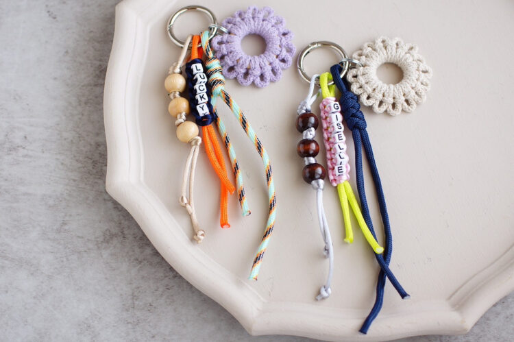 アウトドアコードやウッドビーズなど少しカッコよさも感じられるパーツだけでなく、お花のチャームやカラフルな紐なども使用し可愛らしさもあるデザインのバッグチャームを制作しました♪
