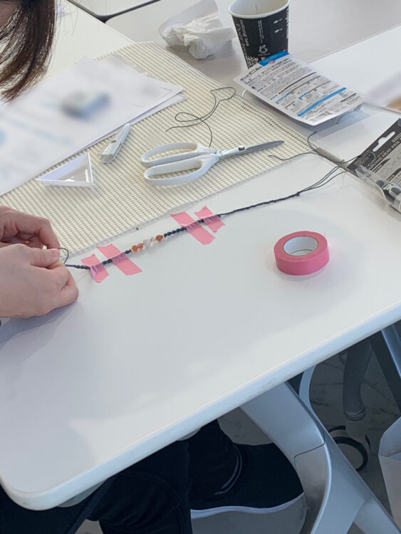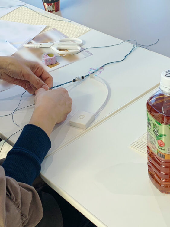 自分のアクセサリーの種類によって天然石の数や糸の長さも変わるので、バランスを考えながら編んでいきます。
