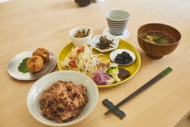今日のメニューは、季節の野菜の昆布締め、自家製がんも、黒豆、サラダ、きんぴらごぼう、昆布の佃煮。お味噌汁に酵素玄米ご飯がついてボリューム満点。
